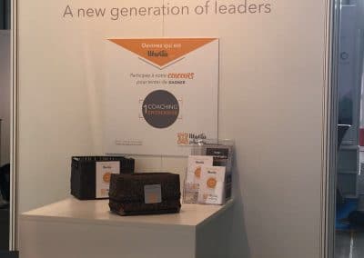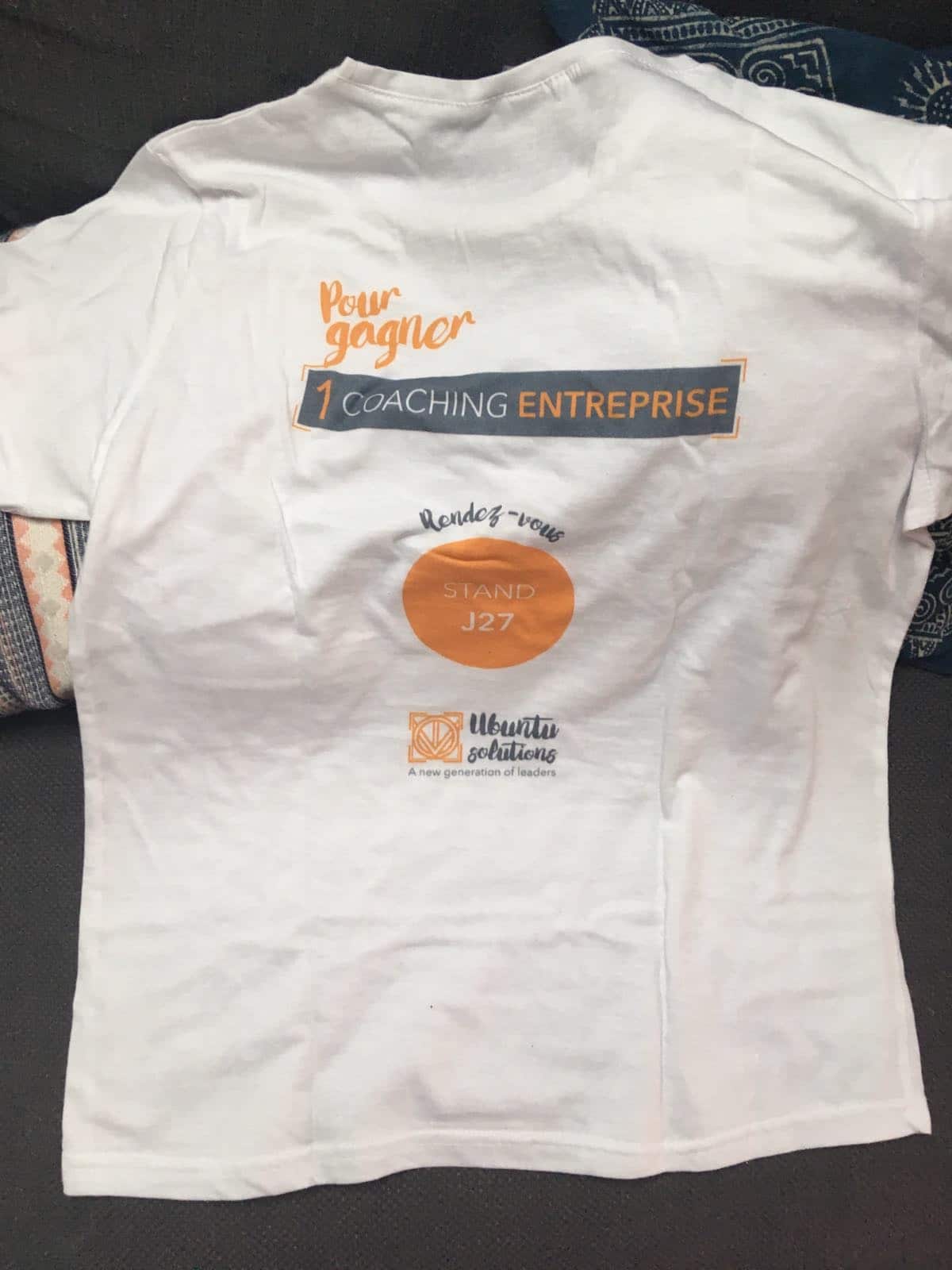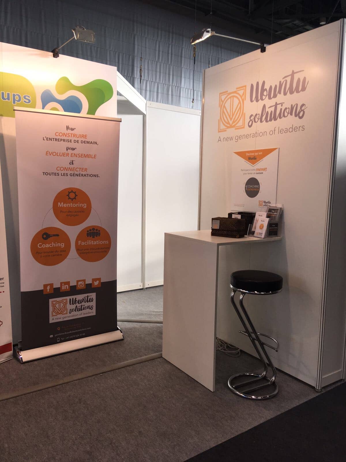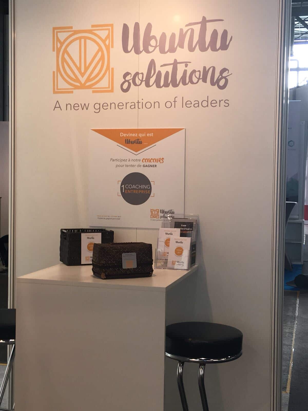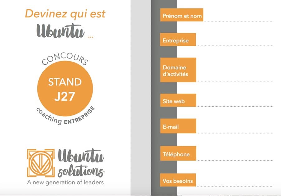Création d’un jeu-concours (afin de récolter des coordonnées), de tee-shirts (hors stand) et d’un roll-up qui a comme vocation d’être « corporate » et de durer après le salon RH, pour assurer la présence d’Ubuntu Solutions sur chacune des présentations, conférences (dont le salon) ou ateliers.